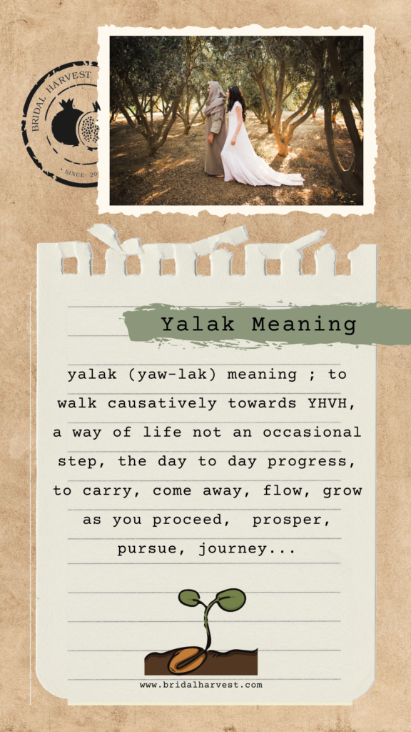 yalak (yaw-lak) meaning ; to wal causatively towards YHVH, a way of life not an occasional step, the day to day progress, to carry, come away, flow, grow as you proceed, prosper, pursue, journey….